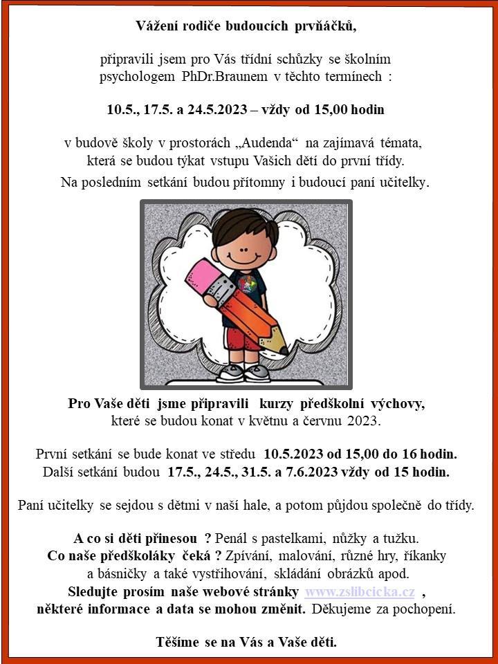 Zároveň budou probíhat besedy se školním psychologem PhDr.Richardem Braunem ve dnech 10.5., 17.5. a 24.5.2023 od 15 hodin.
