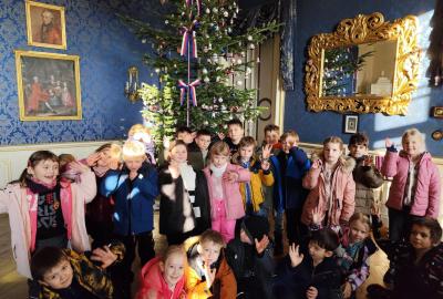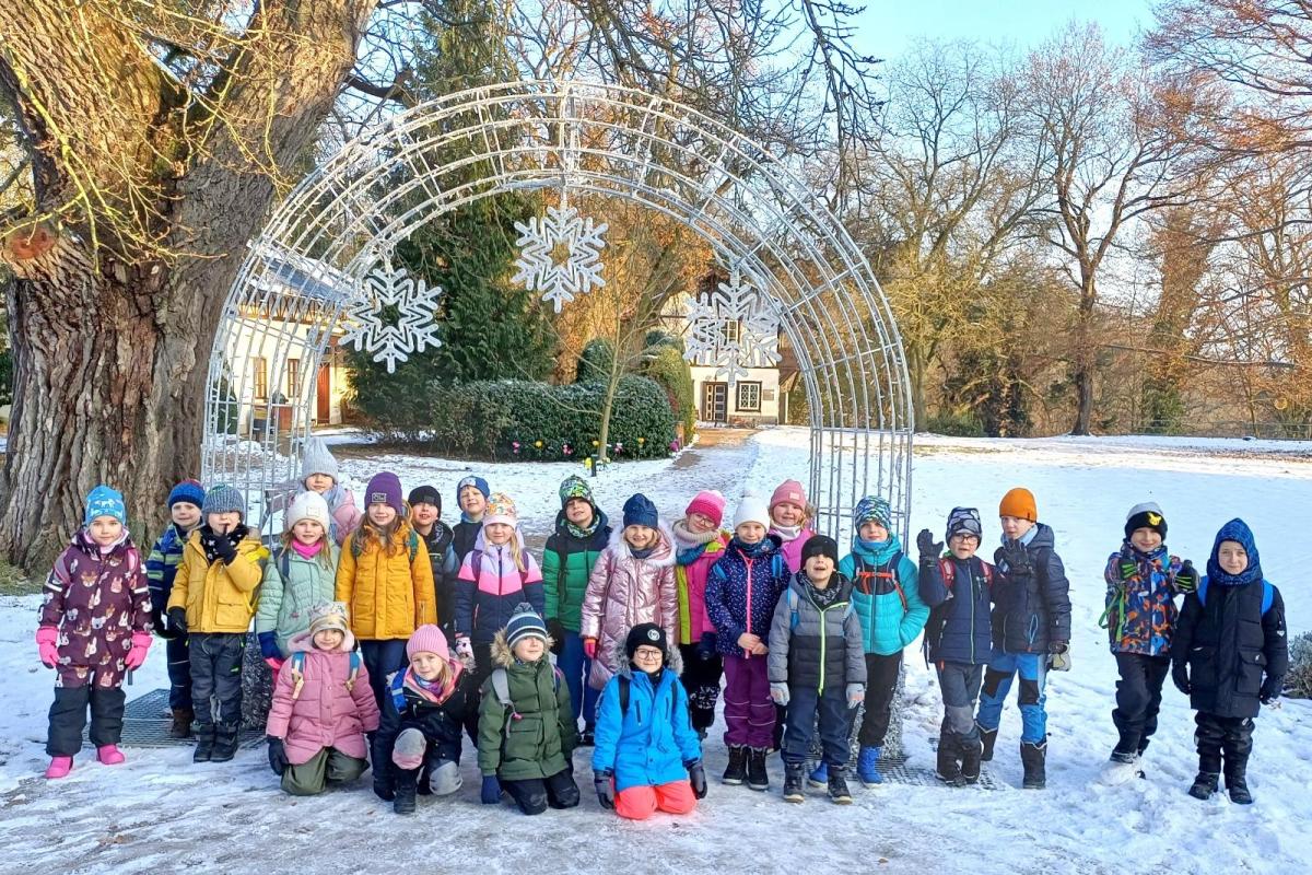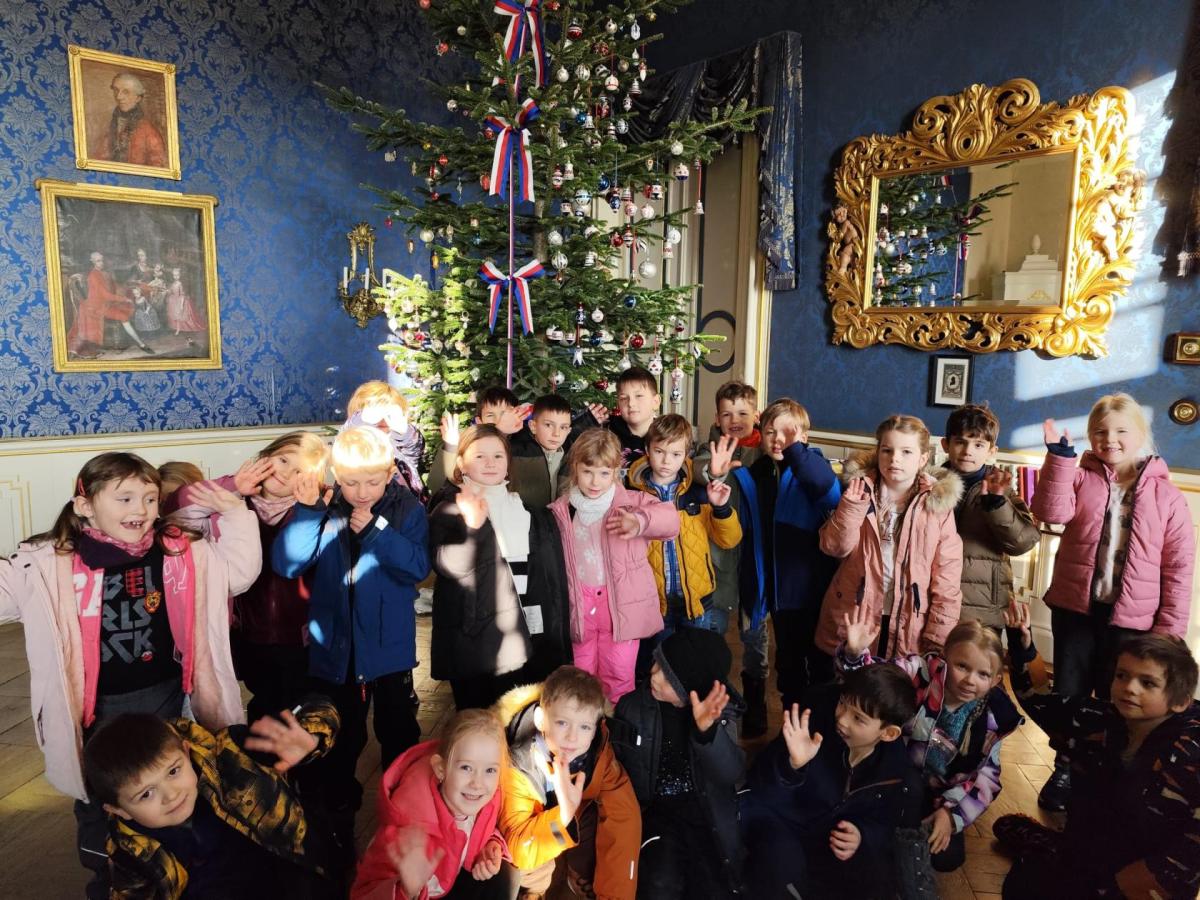 V pátek 28.11.2025 se děti z prvních tříd vydaly zažít vánoční atmosféru na zámek Loučeň. Tam na nás v komnatách zámku čekalo 28 vánočně nazdobených stromečků z celého světa. Zámkem nás provedl vévoda a kněžna a o každém stromečku nám povídali příběh. Na konci prohlídky jsme v kreativní dílně ( zámecké kuchyni ) měli zámeckou svačinku. Nazdobili a snědli jsme perníček a ochutnali vánoční čaj. Na nádvoří jsme viděli největší adventní věnec v Česku. Také jsme se vydali do rozsáhlé zahrady zámku, kde jsme prozkoumali dvě bludiště. Běhali jsme v labyrintech a užili si legraci. Nechyběl ani nákup předmětů na památku. Byl to náš první výlet a moc se nám všem líbil.